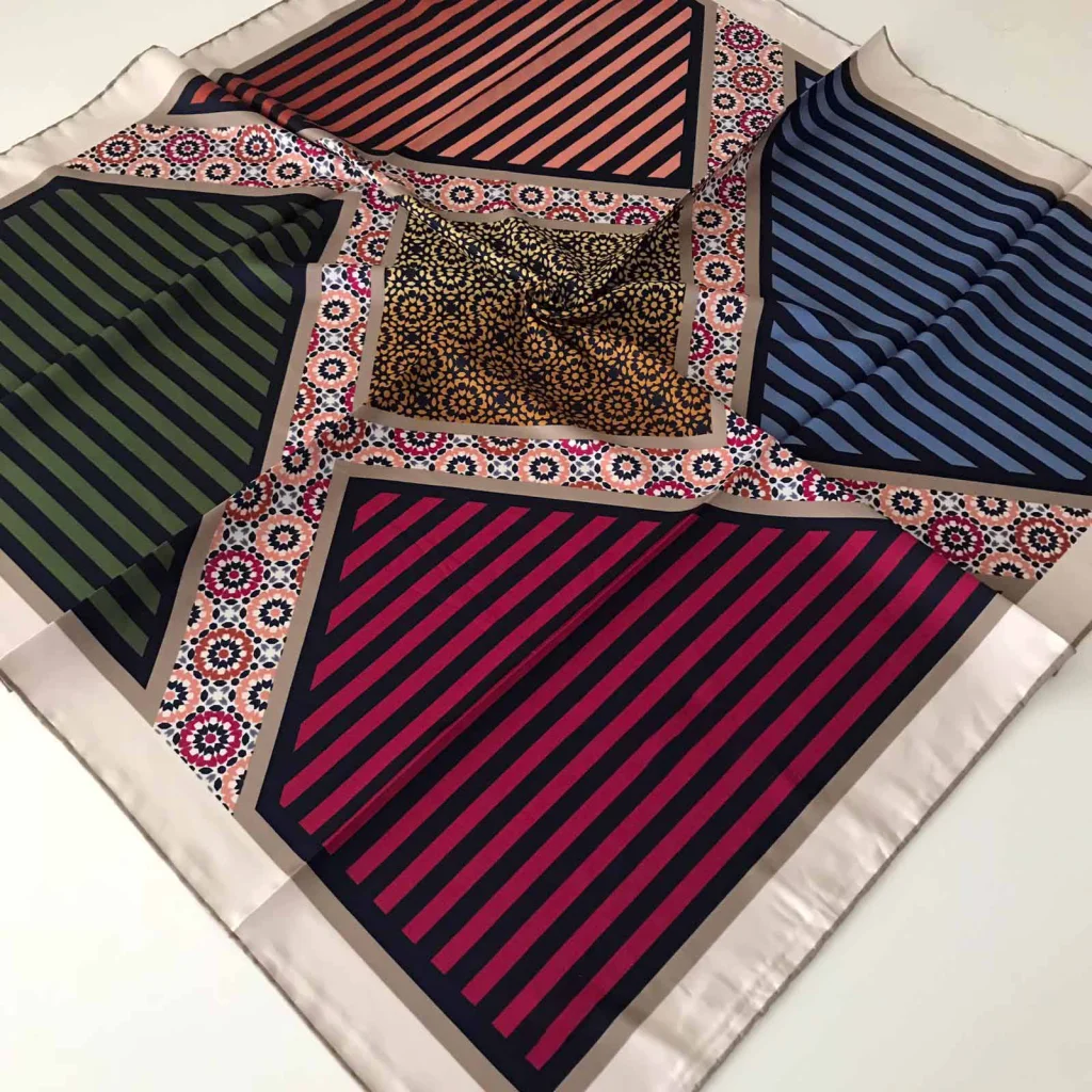 - Foulard carré tissé en Turquie arborant des motifs modernes