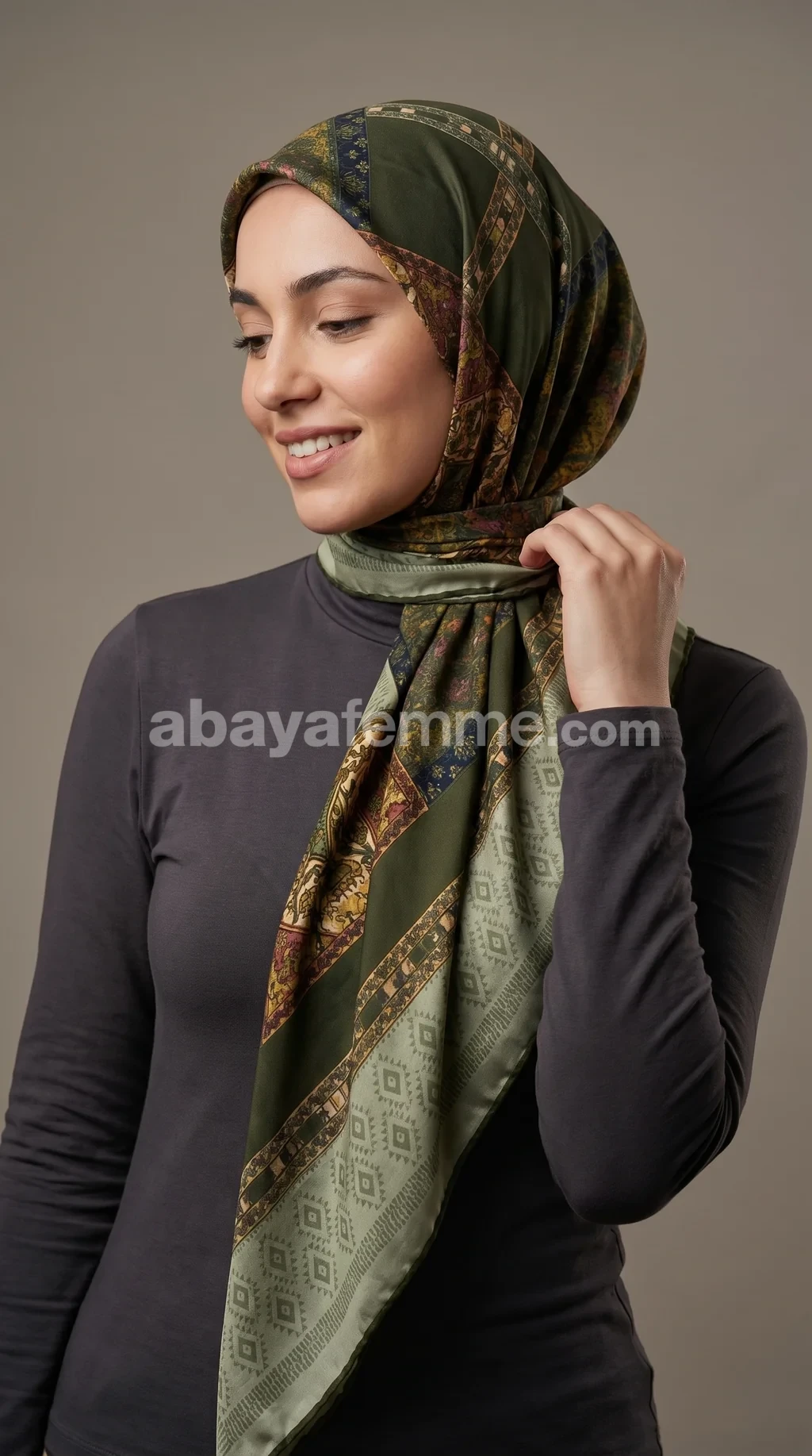 Plié en triangle, posé sur la tête et noué sous le menton pour une couverture élégante et pudique.