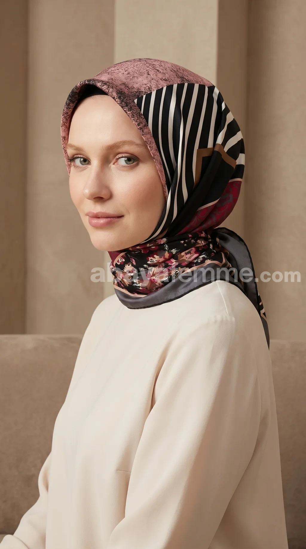 Pour un porté en hijab, nous recommandons l’utilisation d’un bonnet ou d’un bandeau en coton en dessous pour stabiliser la matière satinée sur les cheveux.