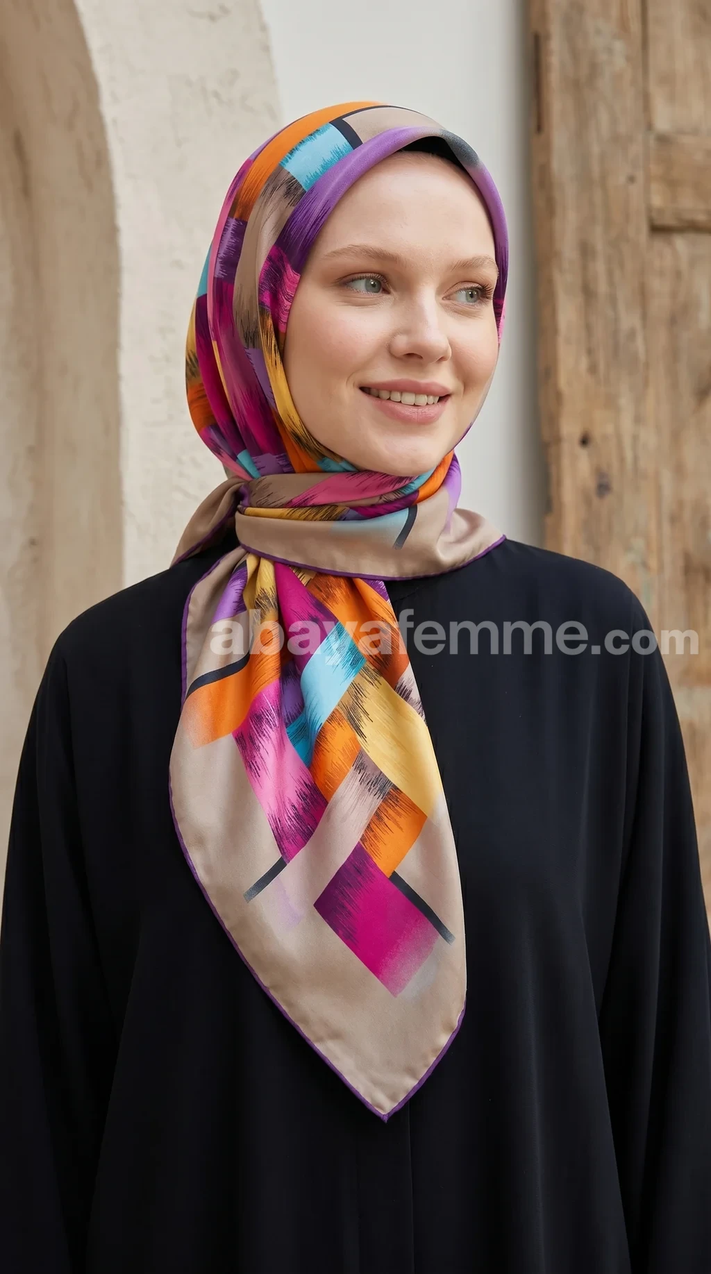 Véritable icône de la mode modeste et sophistiquée, ce carré de soie synthétique incarne l’équilibre parfait entre tradition artisanale et esthétique contemporaine.