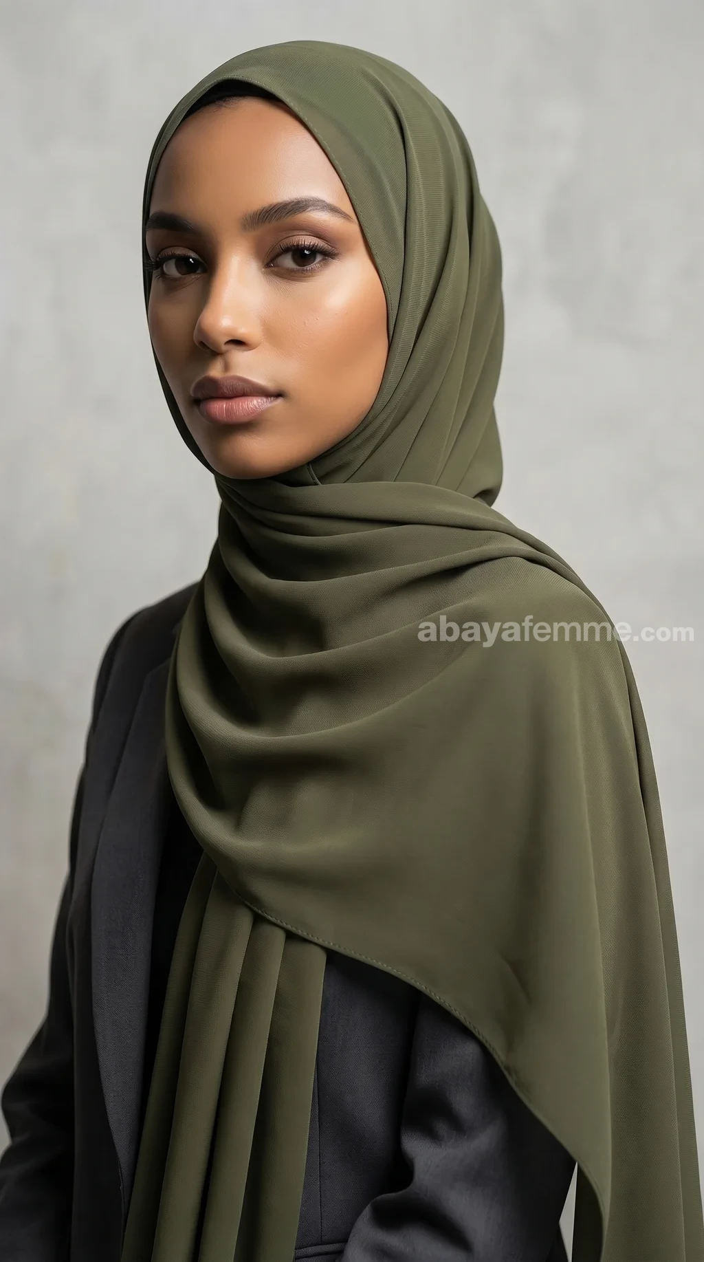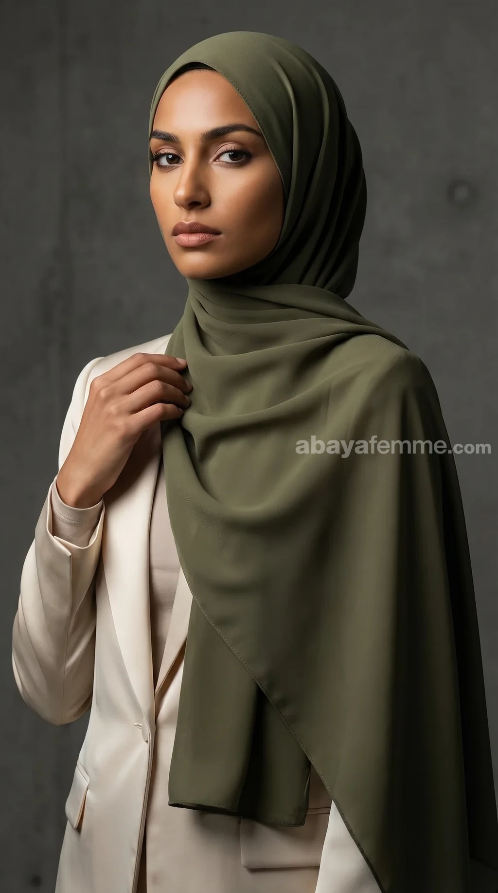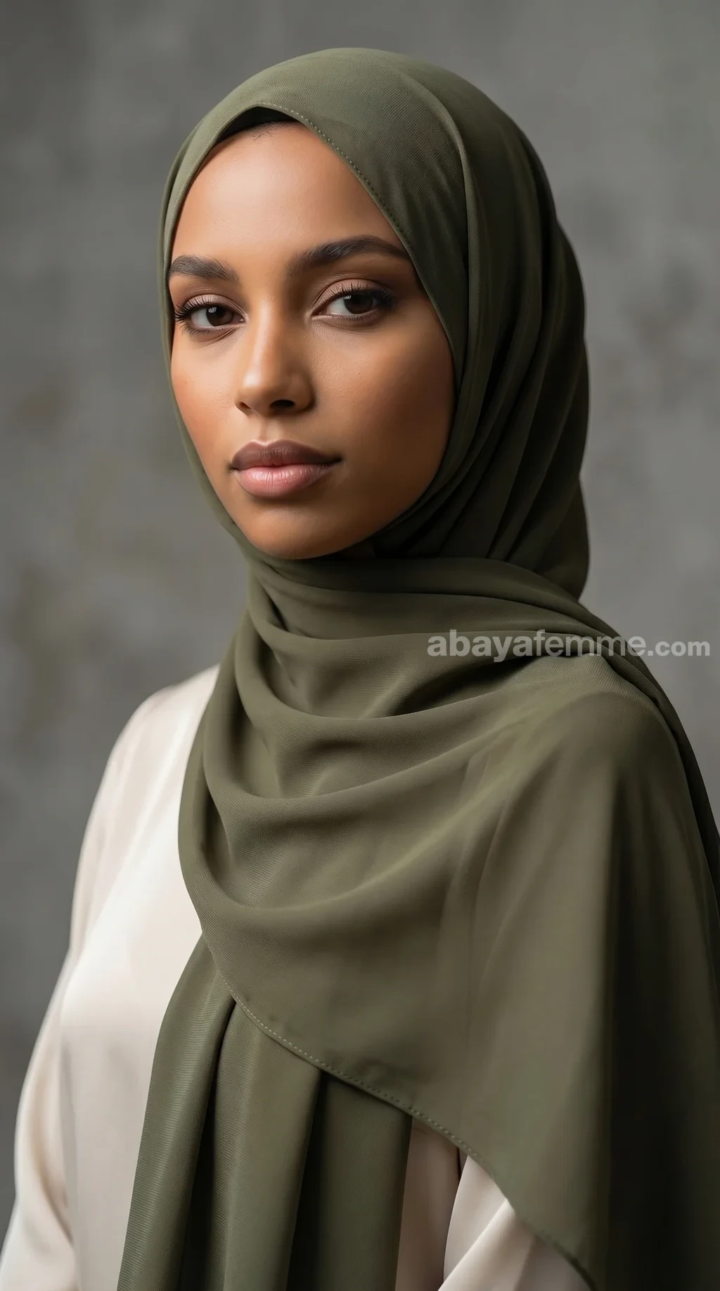 Le vert olive est une couleur très polyvalente. Il se marie magnifiquement avec des abayas beiges, nudes, blanches, ou même noires pour un contraste saisissant et chic.