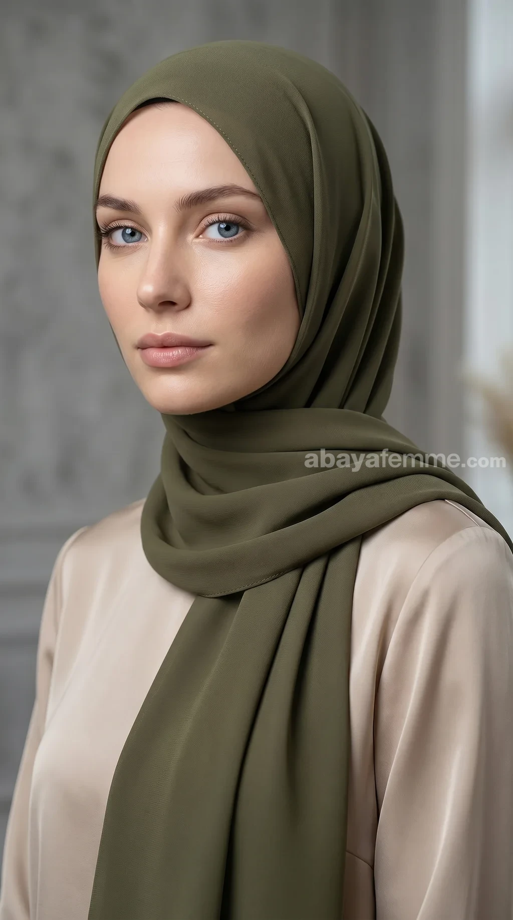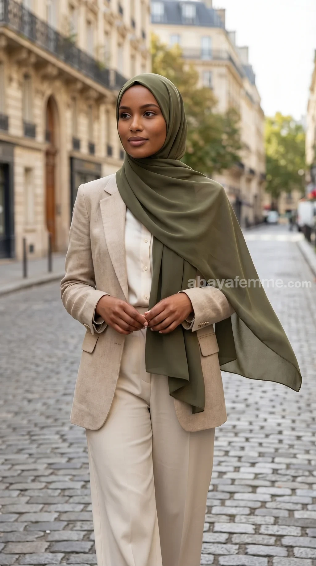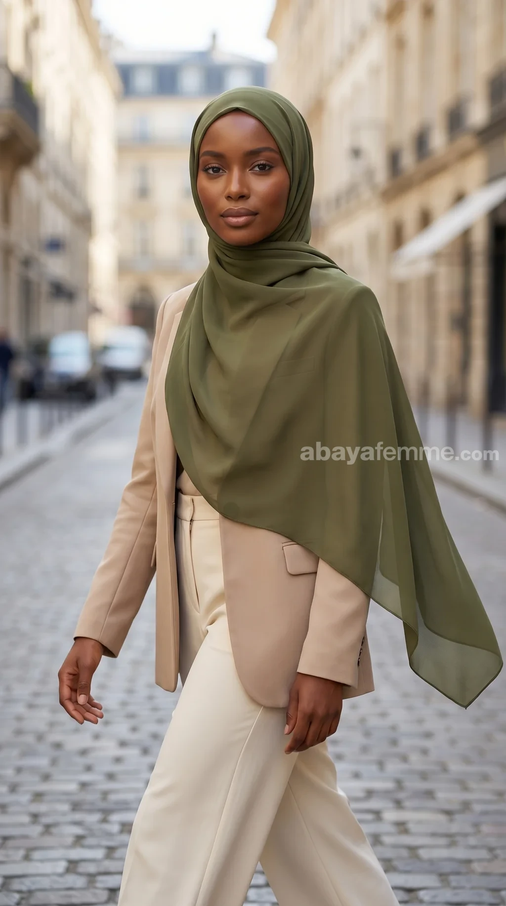 Le vert olive est une couleur très polyvalente. Il se marie magnifiquement avec des abayas beiges, nudes, blanches, ou même noires pour un contraste saisissant et chic.