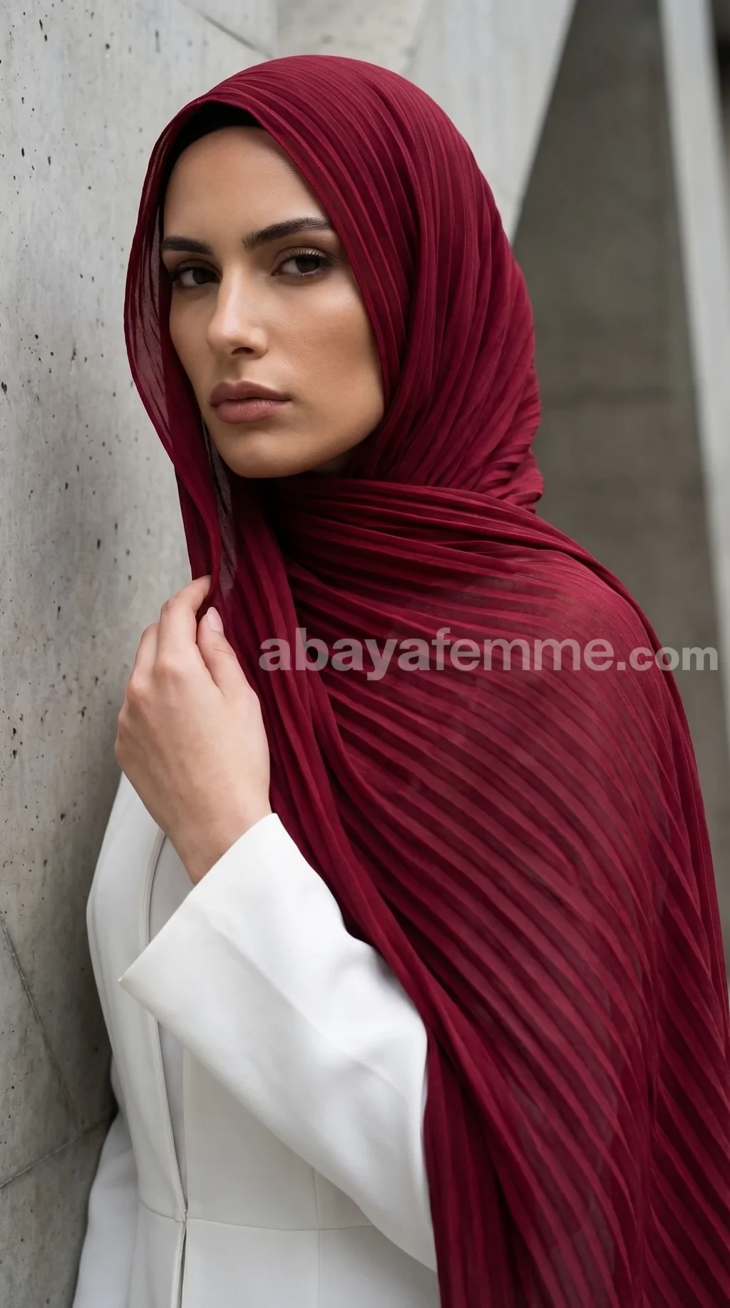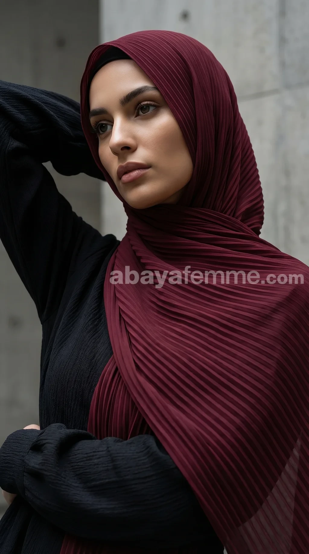 Sublimez votre style avec ce hijab en mousseline plissée accordéon d’un rouge bordeaux profond. Une pièce fluide, texturée et infiniment élégante pour toutes vos occasions.
