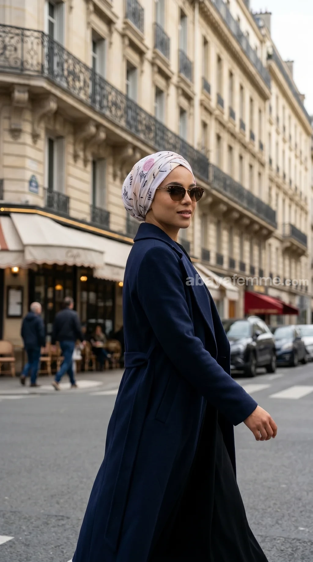 Pliez le carré en triangle, fixez-le sous le menton avec une épingle discrète et rabattez les deux pans sur vos épaules pour un look traditionnel et élégant.