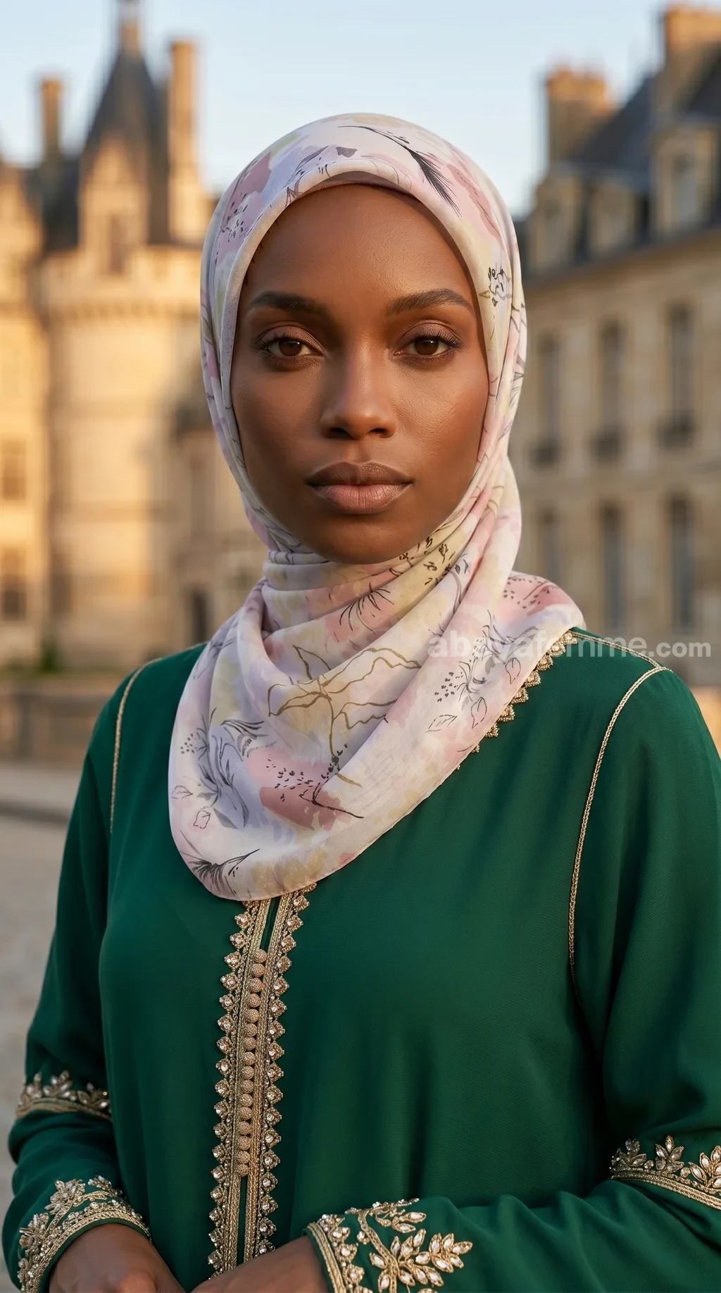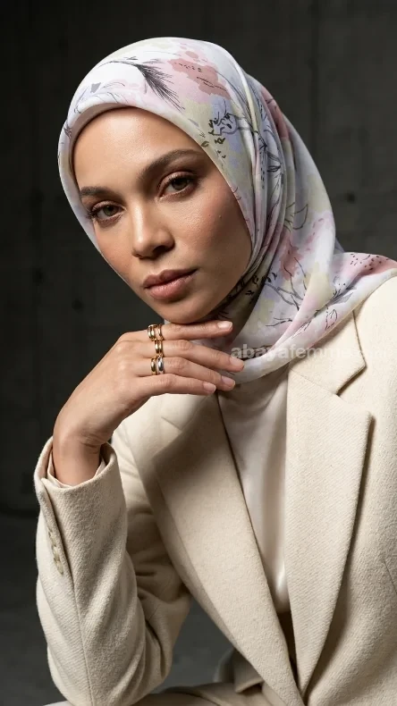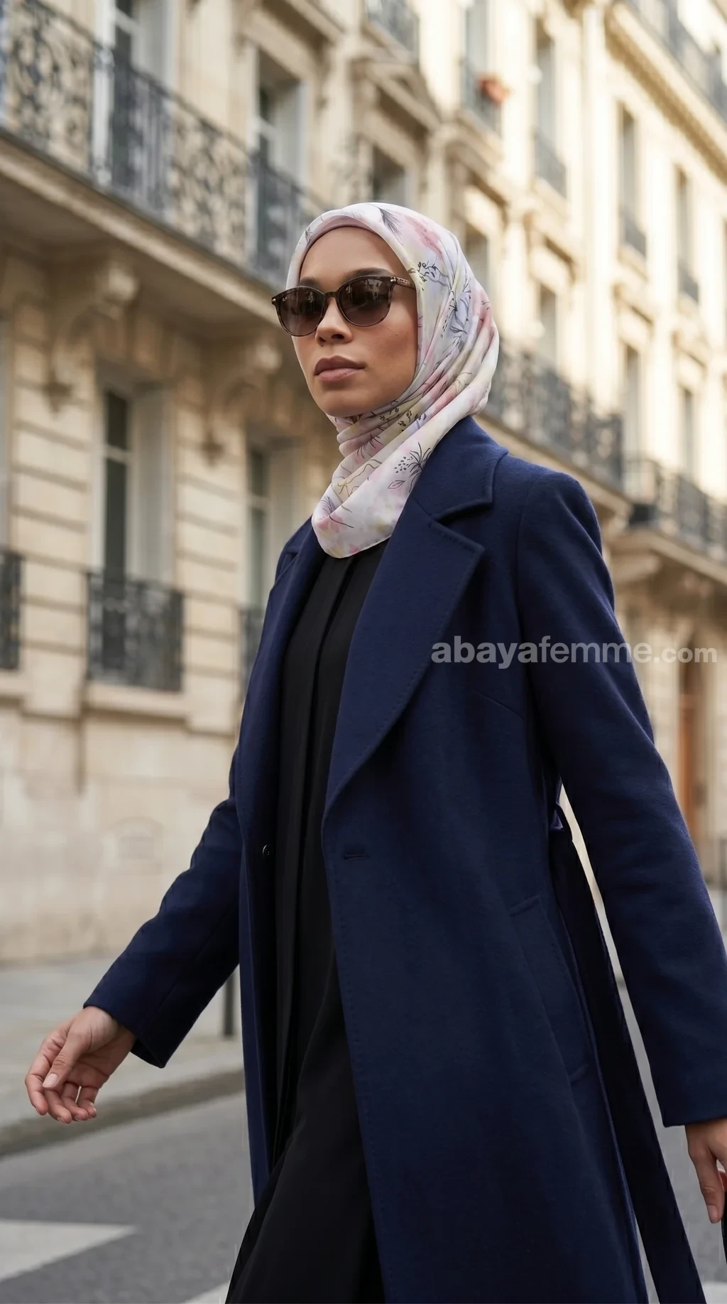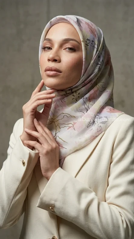 Laissez retomber une pointe sur l’épaule pour un effet fluide et romantique, parfait avec une abaya de soirée.