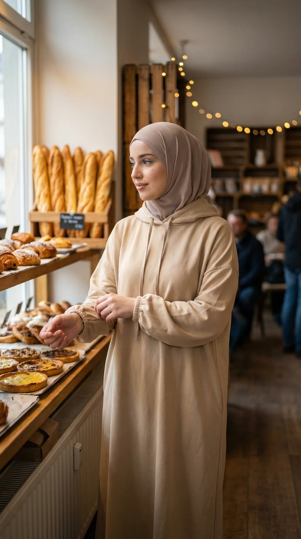 Abaya à capuche beige bi-stretch, moderne et ultra confortable, parfaite pour un look mastour casual et tendance.