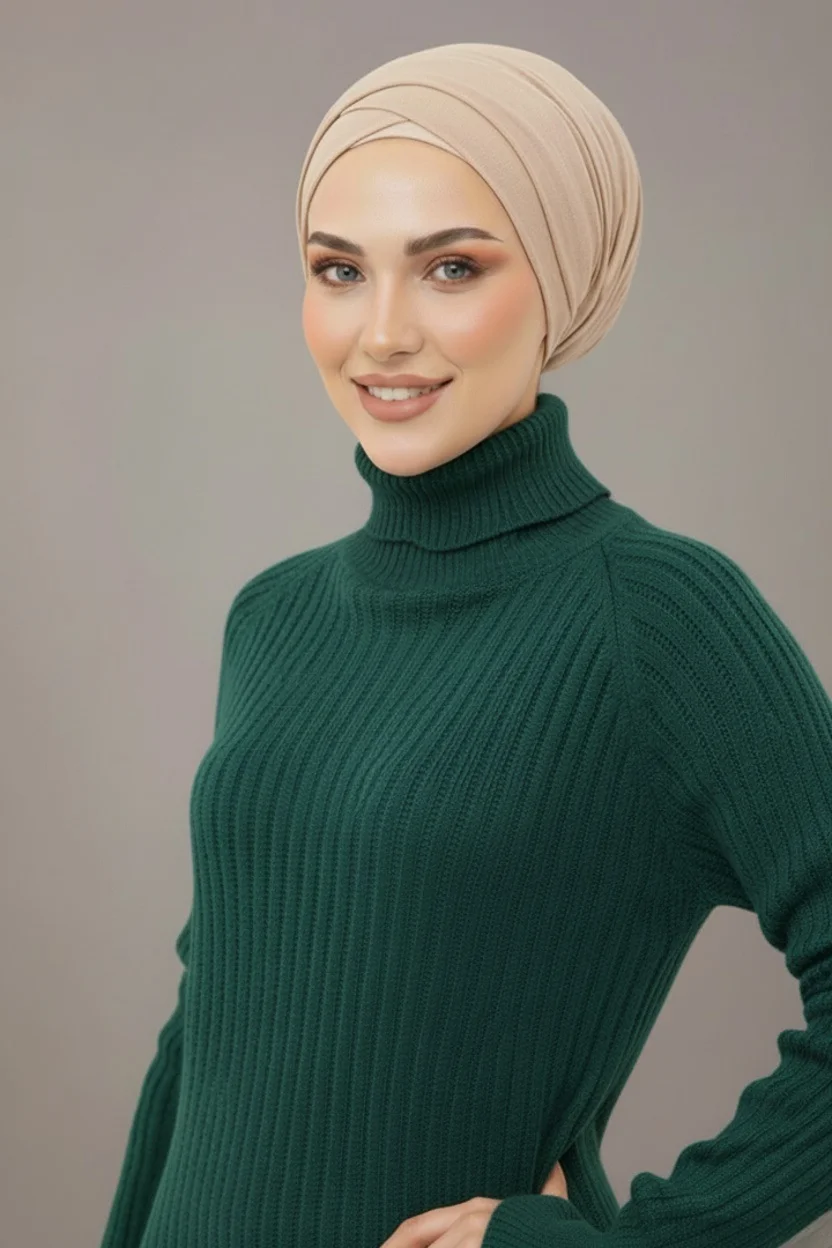 Pull long en maille vert canard, col roulé et coupe 1 mètre. Élégant, chaud et parfait pour vos looks automne-hiver.