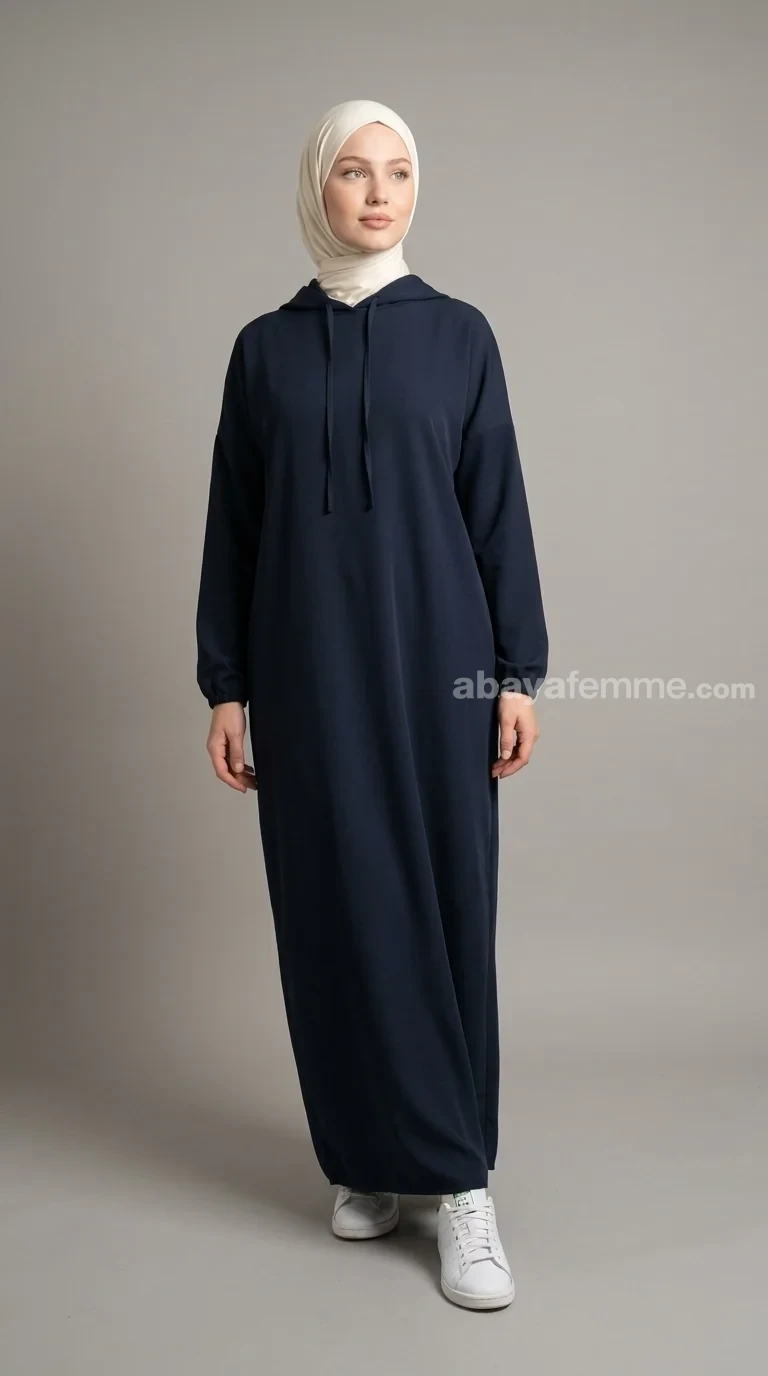 L’élégance décontractée : abaya à capuche en bi-stretch bleu marine