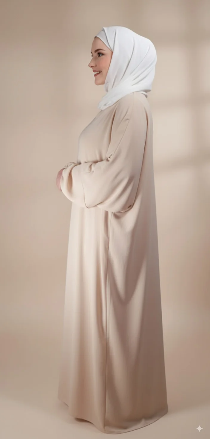 Exprimez élégance et modestie avec l’Abaya Beige Simple Longue et Ample. Conçue pour la femme moderne qui valorise le confort sans compromettre le style.