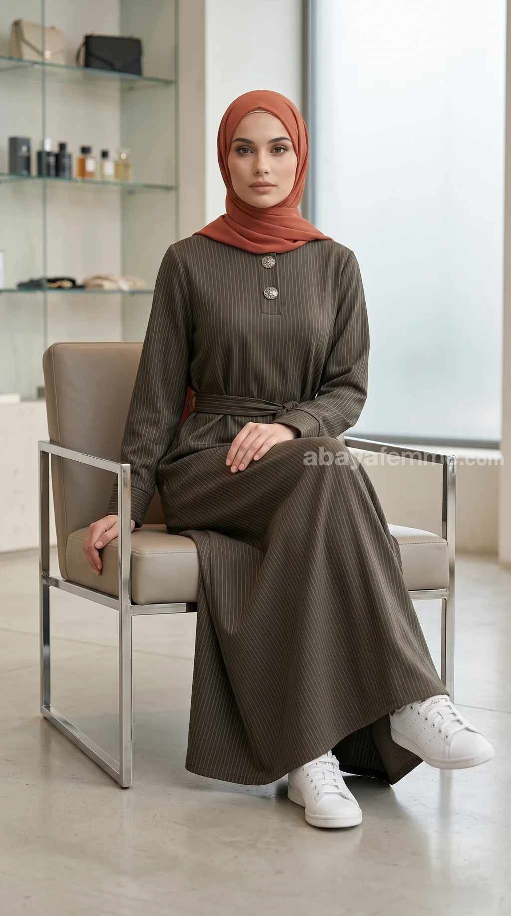 Nouez la ceinture, ajoutez des talons discrets et un hijab en soie de Médine pour une allure sophistiquée.