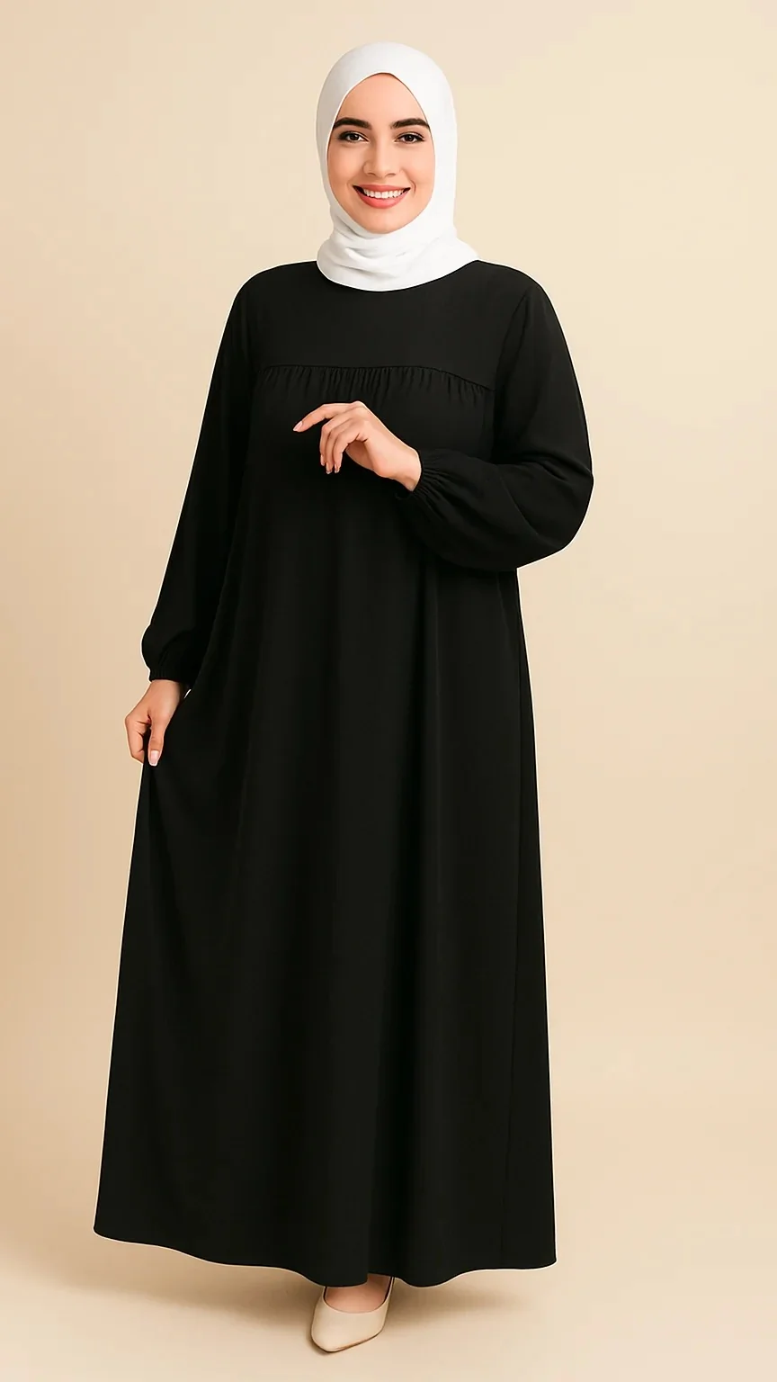 L’attention portée aux finitions est manifeste dans les manches longues dotées d’élastiques, permettant un ajustement parfait au niveau des poignets, ainsi que dans les plis délicats situés à l’avant et à l’arrière de la robe. Ces détails ajoutent une touche de sophistication et de féminité à l’ensemble, tout en restant fidèles aux principes de modestie.