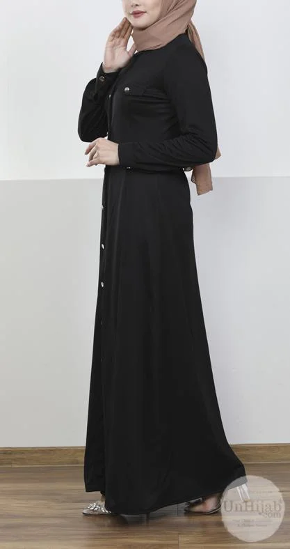 Opter pour la Robe Longue Boutonnée Noir d’abayafemme.com, c’est faire le choix d’une abaya pas chère sans lésiner sur la qualité. Son design intemporel, associé à une grande praticité et à un confort exceptionnel, en fait un choix privilégié pour celles qui cherchent à allier modestie et élégance.