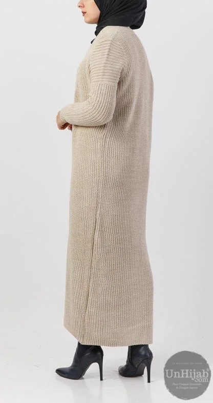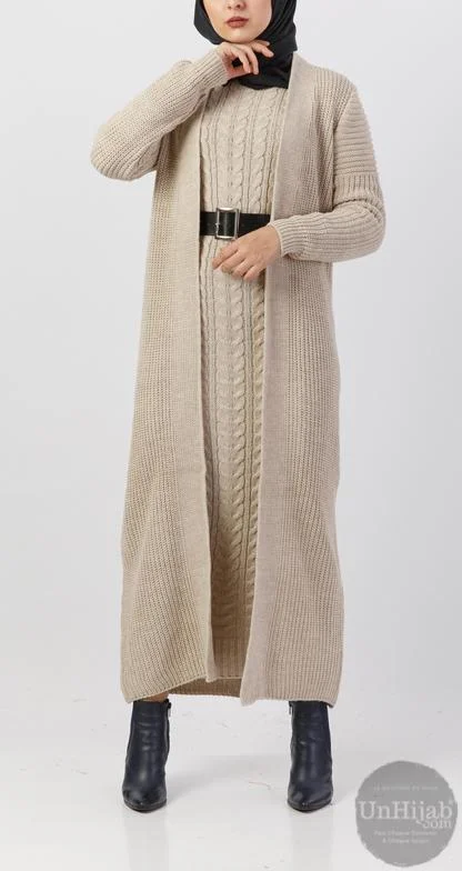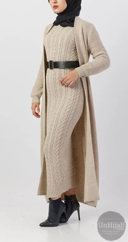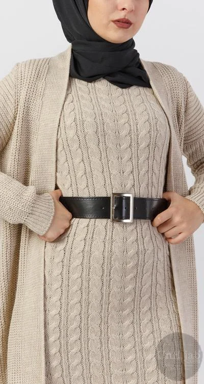 Ensemble confortable simple et parfait pour l’Automne-Hiver, robe manche longue avec son gilet en maille torsadée avec finition côtelée à la base et en bas de manche. cet en ensemble tricot est de taille unique équivalente aux tailles comprises entre le 36 et le 44